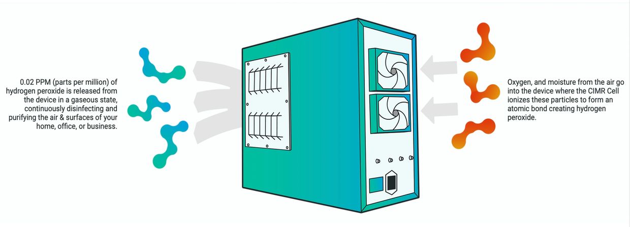 H2O2 continuously converts the natural humidity in the air (H2O) to dry air gas molecules (H2O2). The natural state of water is H2O, which is two hydrogen atoms and one oxygen atom. Hydrogen peroxide air gas has an extra oxygen atom that acts as a weapon against pathogens that are atomically attracted to water. For example, pathogens such as COVID-19 seek moisture in order to survive, exchange waste, and replicate. When pathogens diffuse H2O2, the extra oxygen atom creates a covalent bond that releases energy, which deactivates the nucleus and destroys the cell wall.